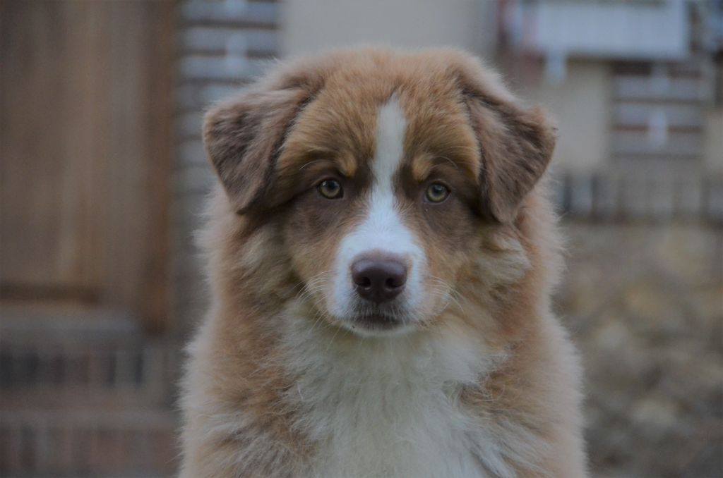 Rouge merle yeux bleus. Une vraiment très jolie tête, un très bel oeil. Beaucoup de substances. Ensemble extrèmement plaisant. Superbe présentation. Très jolis déplacements